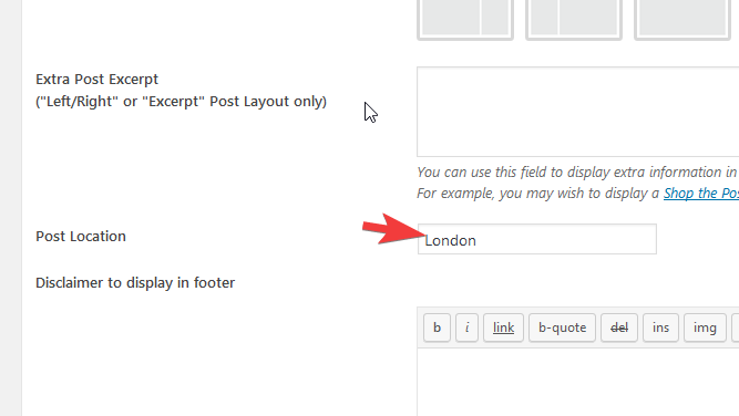 Whether or not to display the post's location above the title. The location of the post can be site via the "Extra Post Options" section of the post editor. Please note this option might not be available in some themes. Set to "true", or "on" to display.